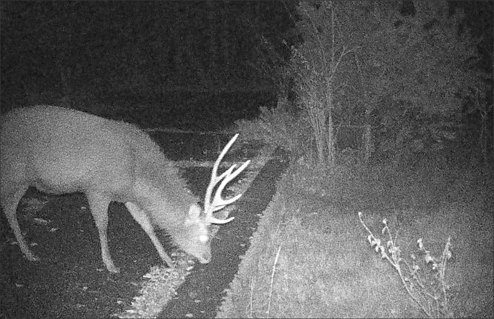 深夜、家の周りに草を食べに出てきた立派なツノを持った鹿。