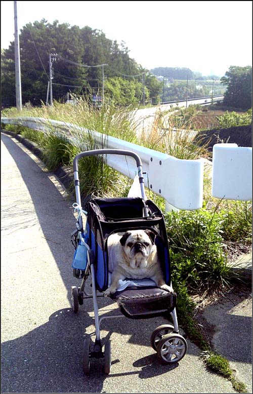 ずいぶん暑くなってきたのでカートの散歩は早朝にしている。
