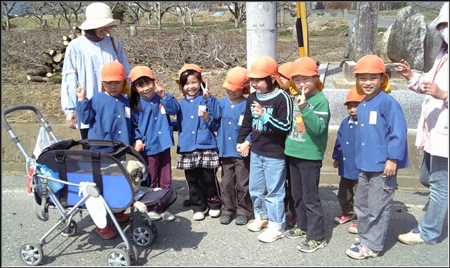 散歩中に保育園の生徒に出会った。子供たちにどうして車に乗ってるのと聞かれたので