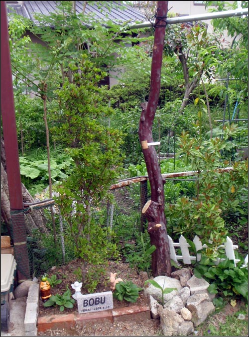 ボブが毎日遊んだ庭の隅に春に咲く霧島ツツジを植えました。